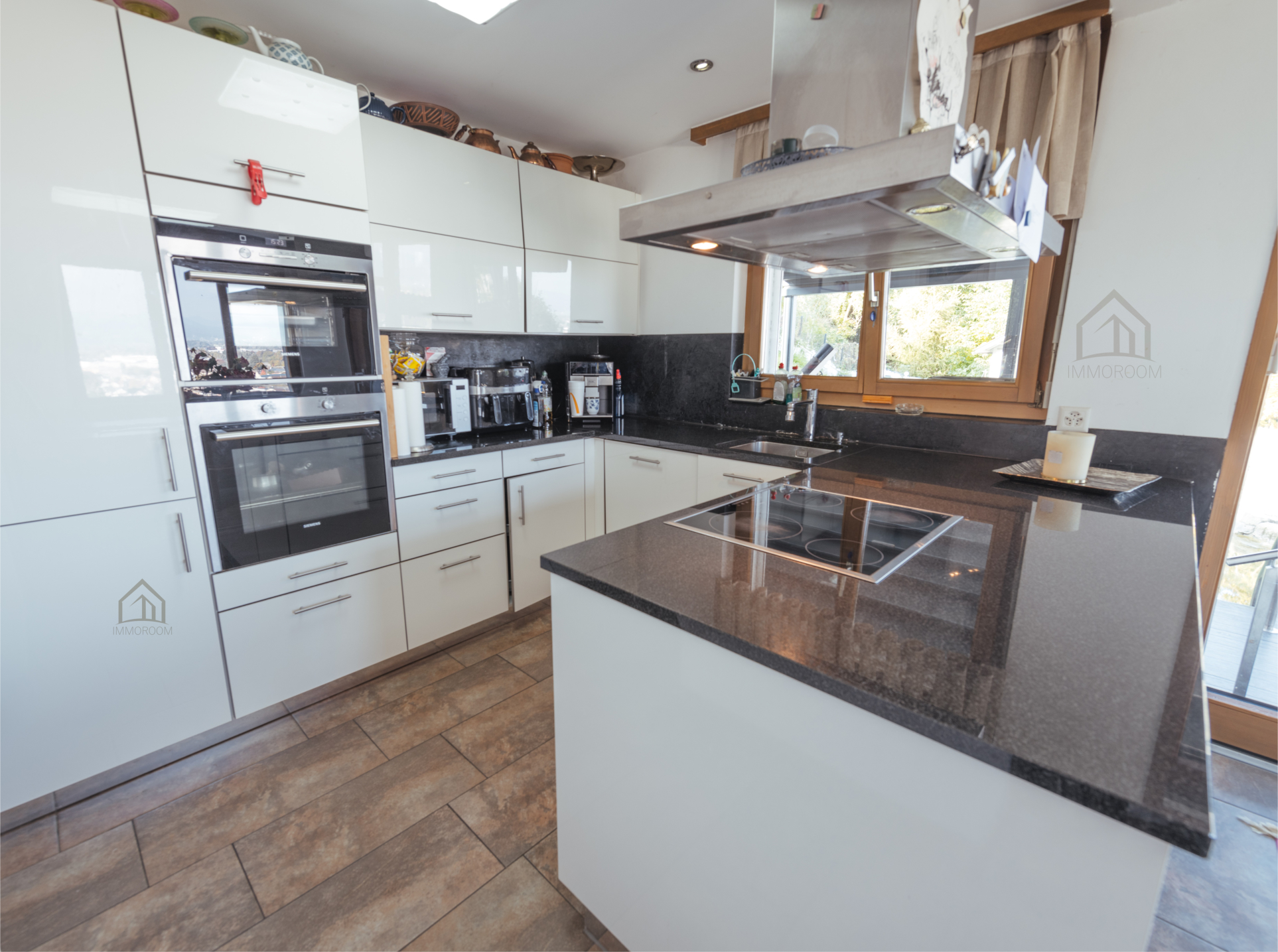 Die moderne Küche fügt sich harmonisch in den Raum ein und bietet viel Platz für gemeinsame Momente. Von hier aus gelangt man jeweils nach Norden und Süden direkt auf den überdachten Sitzplatz beziehungsweise in den Wintergarten.